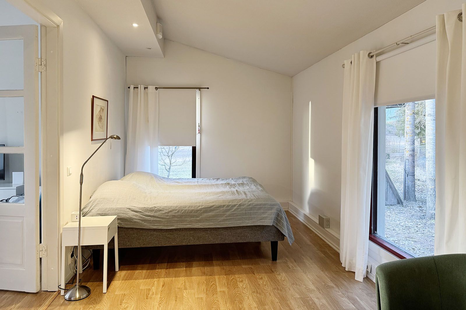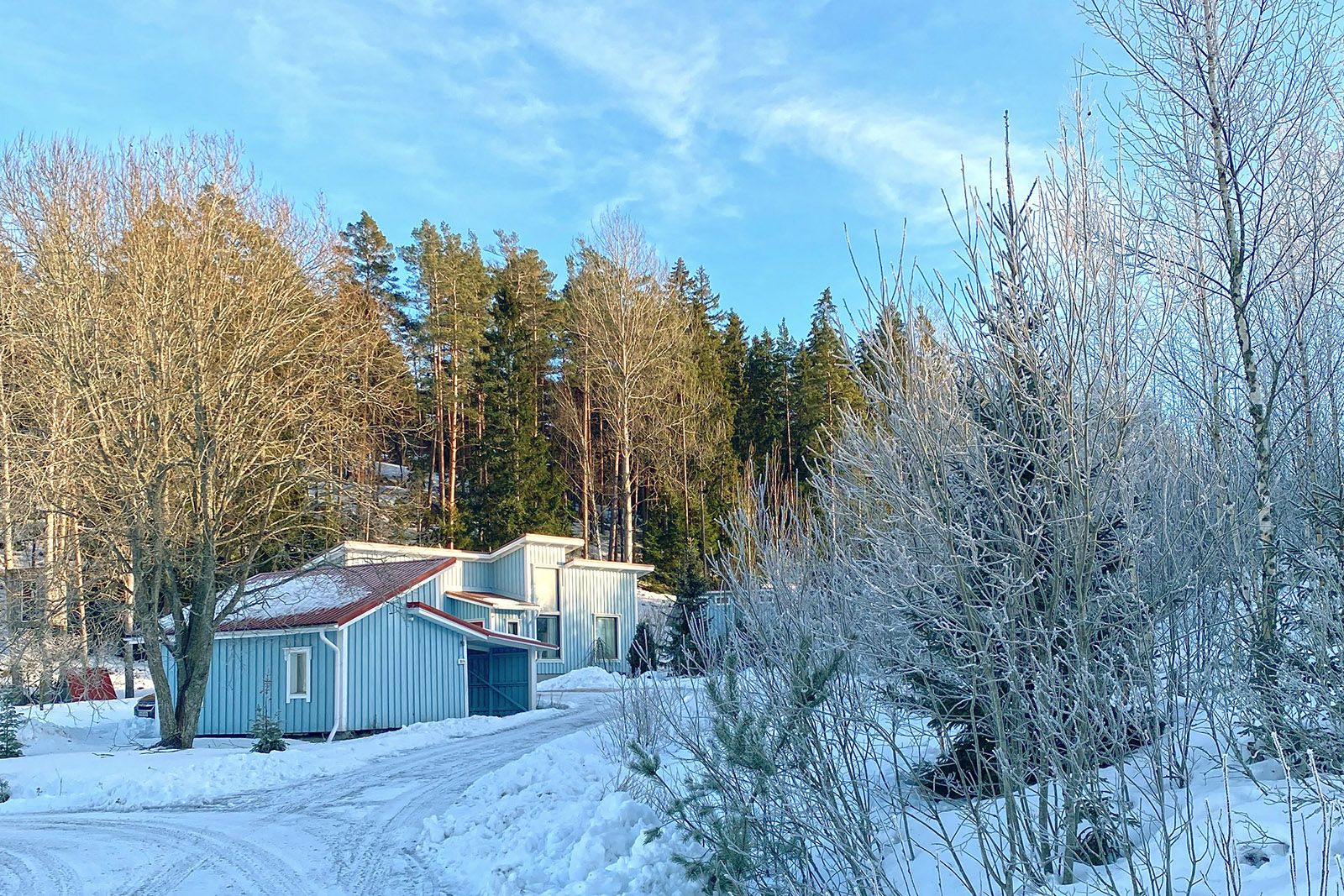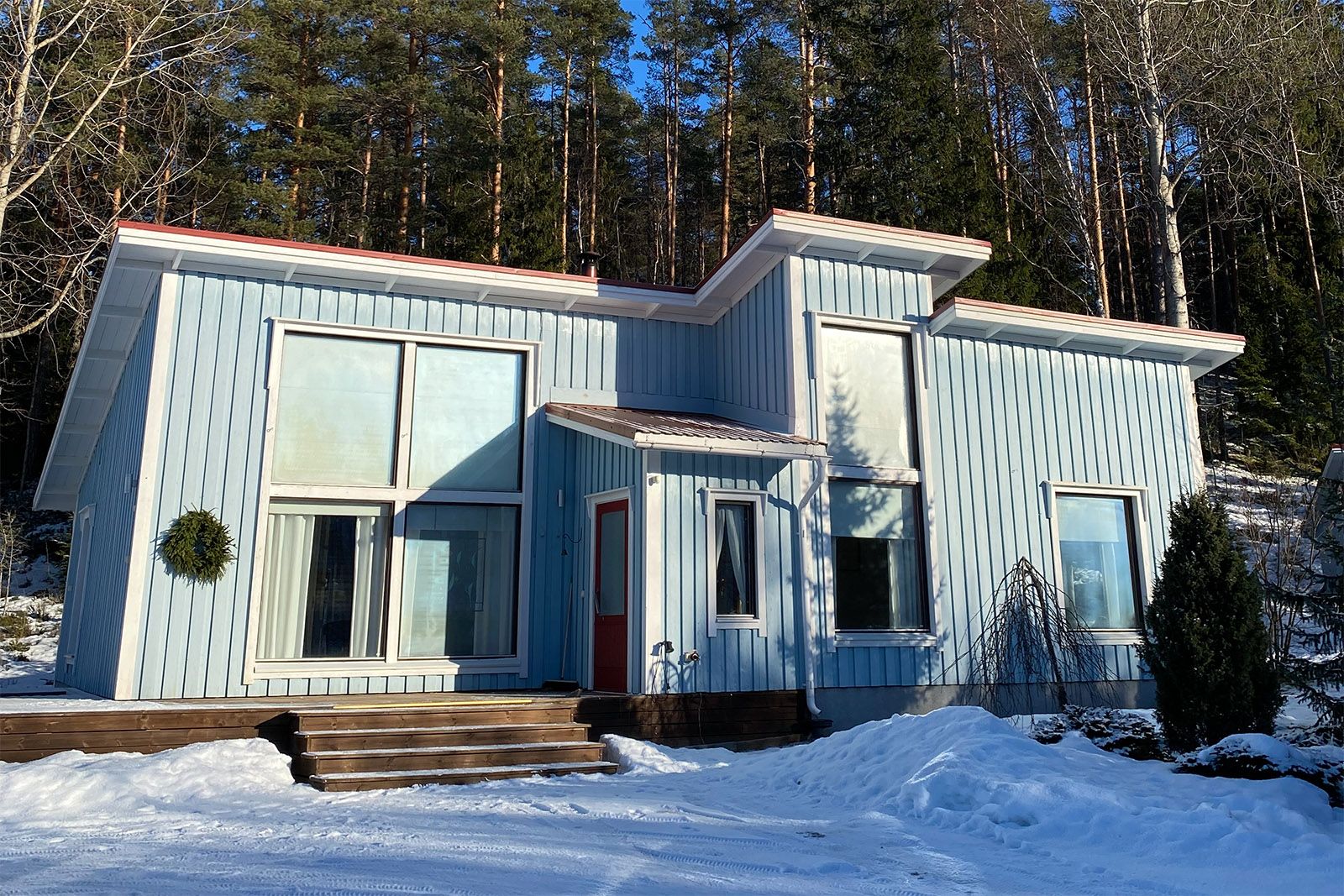 Suuret ikkunat antavat valoa moderniin, lasipajaksi suunniteltuun taloon Kemiönsaaressa. Tammikalliossa on omaa tilaa peltoon ja metsään rajoittuvalla tontilla, hyvien kulkuyhteyksien varrella. Pääset Tammikallioon helposti autolla, bussilla tai polkupyörällä. Autolla Tammikallioon pääsee Helsingistä noin kahdessa tunnissa, Turusta 45 minuutissa.